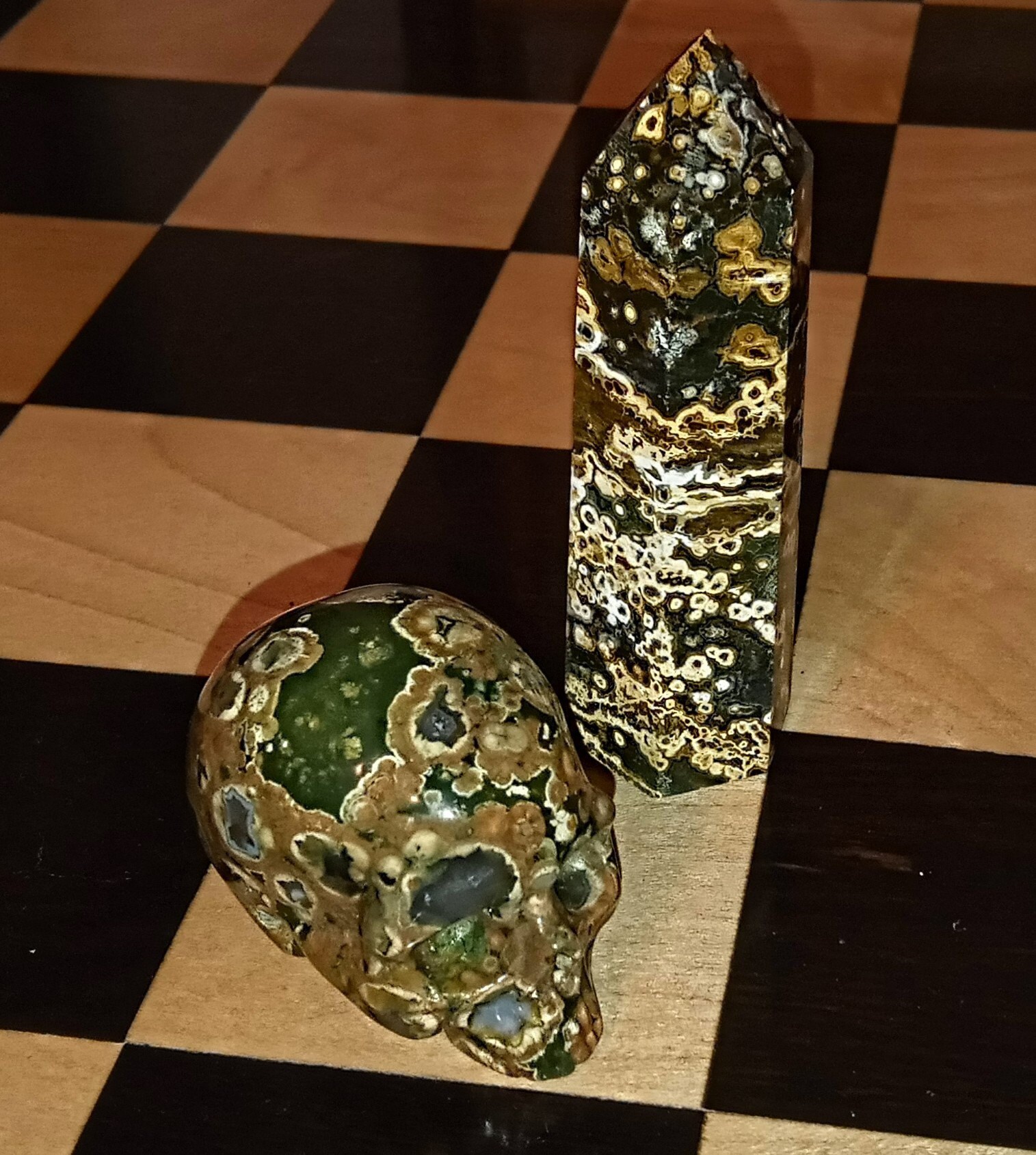 Deposits of this stone are found only in one small place in Madagascar. Their name is a trade name that was created by the collectors due to the location, near the ocean, where they get them from. It is not easy for the collectors to obtain, as the location where it is found is in a small opening or cleft at the bottom of a cliff. It can only be taken out at low tide and then only in a boat so it isnβt easy to obtain. It is a member of the quartz family, meaning that it has a high amount of the mineral silica in it. This is why in some pieces you can see pieces of lovely sparking druzy quartz within the stone. It is also known as Ocean Orbicular Jasper, Cellular Jasper and also as Atlantis stone. Orbicular Jasper meaning relates to the stones having spherical or rounded shapes in them.
