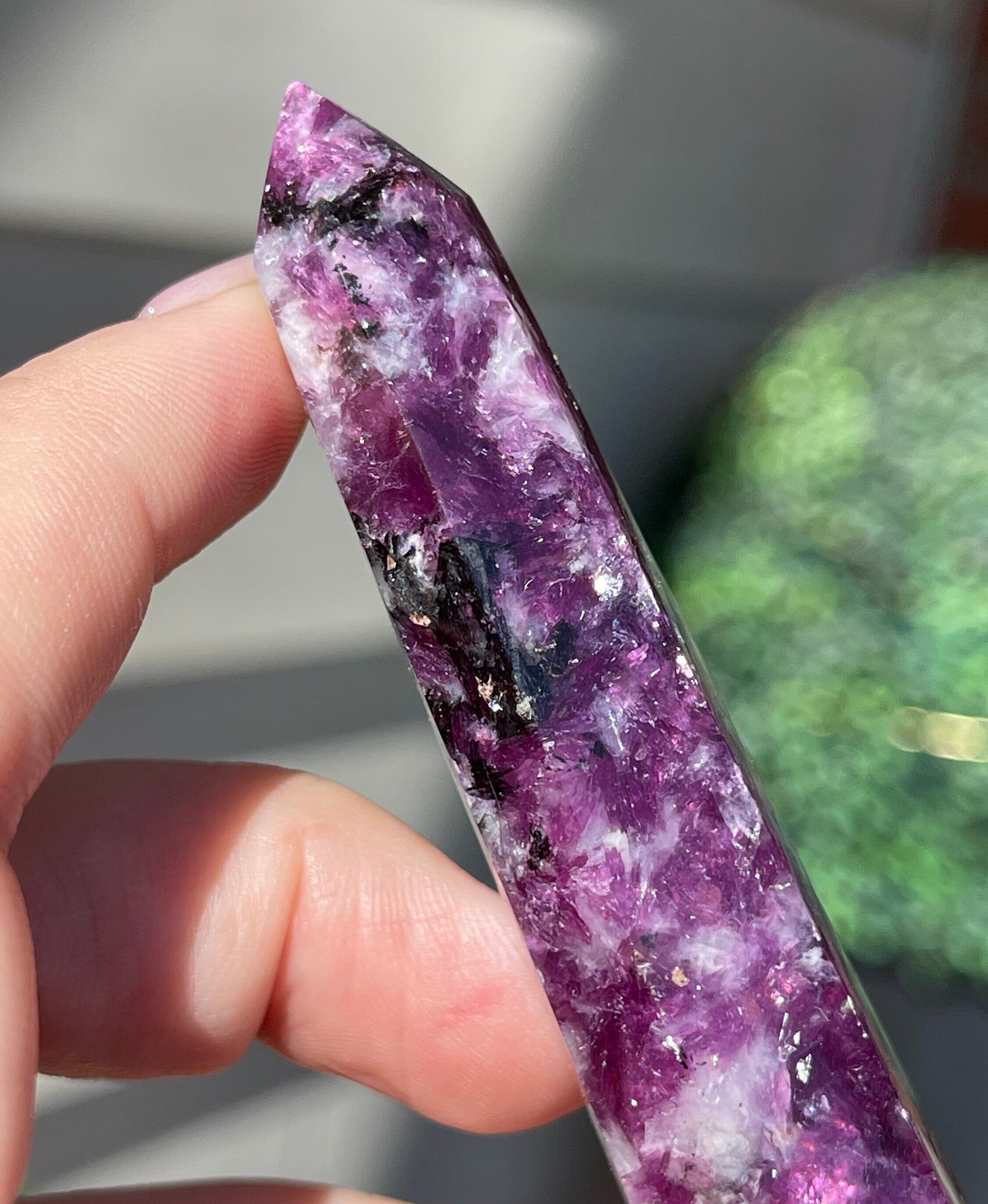 Rare find Kunzite and Gem Lepidolite Tower ! Size: approximately ( 96 MM ) π Science & Origin : Kunzite is a gemstone that gets its pink-violet color from trace amounts of manganese. The gem has growing popularity in high-end jewelry due to its size and clarity, However, it is a difficult stone to cut and has a tendency to cleave.