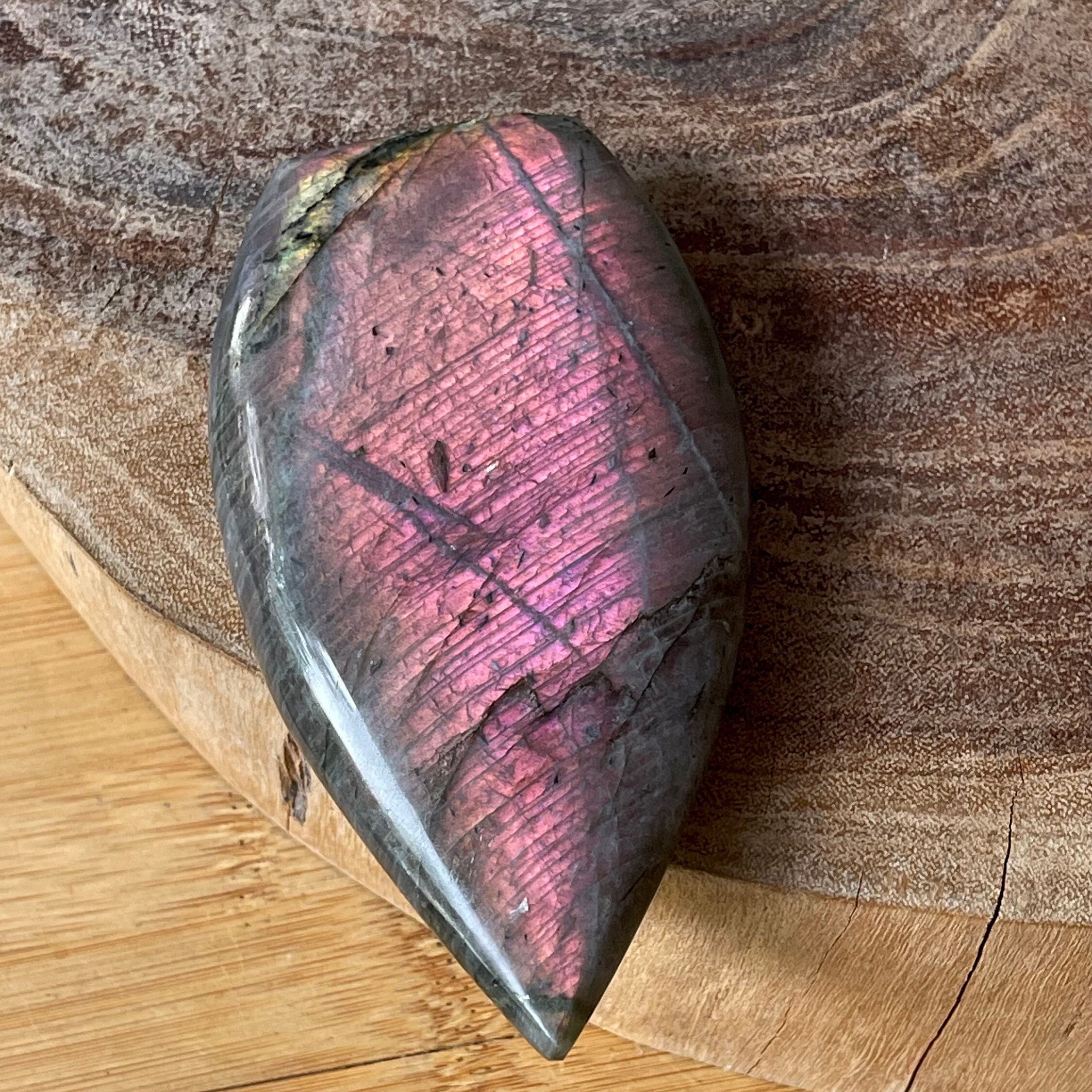 Full of Orange Purple Pink flash Labradorite Flame π₯ ! The Colors are Amazing, size approximately 110 MM π Video taken outside in direct sunlight on the iPhone π± NOTICE : We do NOT apply anything to our crystals ( water, oil , resin or anything else ). Pictures and videos are taken in natural sunlight of the actual item you will receive. Please review our shopβs policies before purchasing! π
